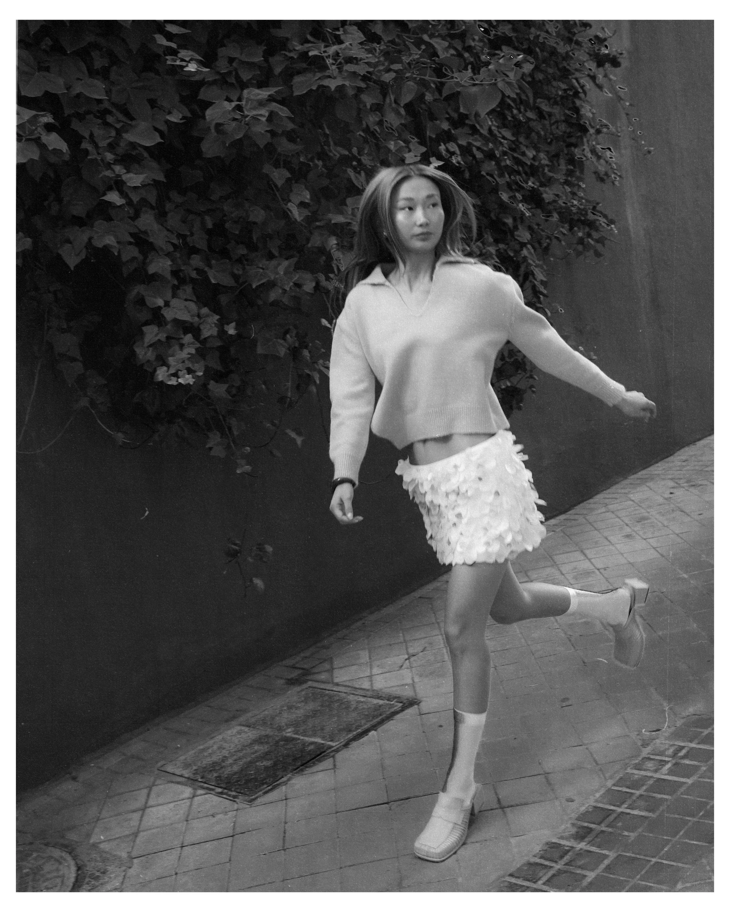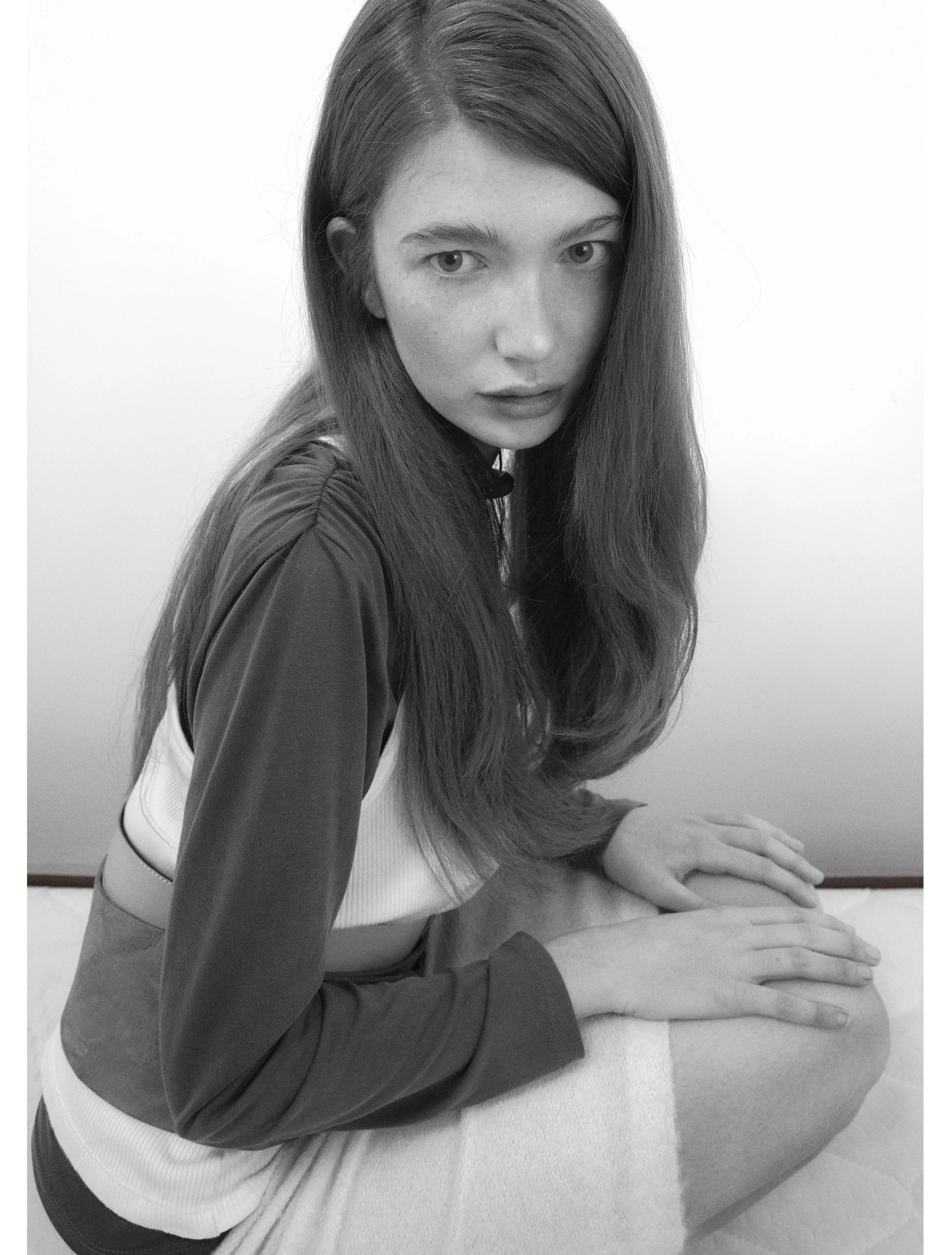 Retrato en blanco y negro de una mujer joven con cabello largo y liso, posando en cuclillas sobre una superficie y mirando hacia la cámara.