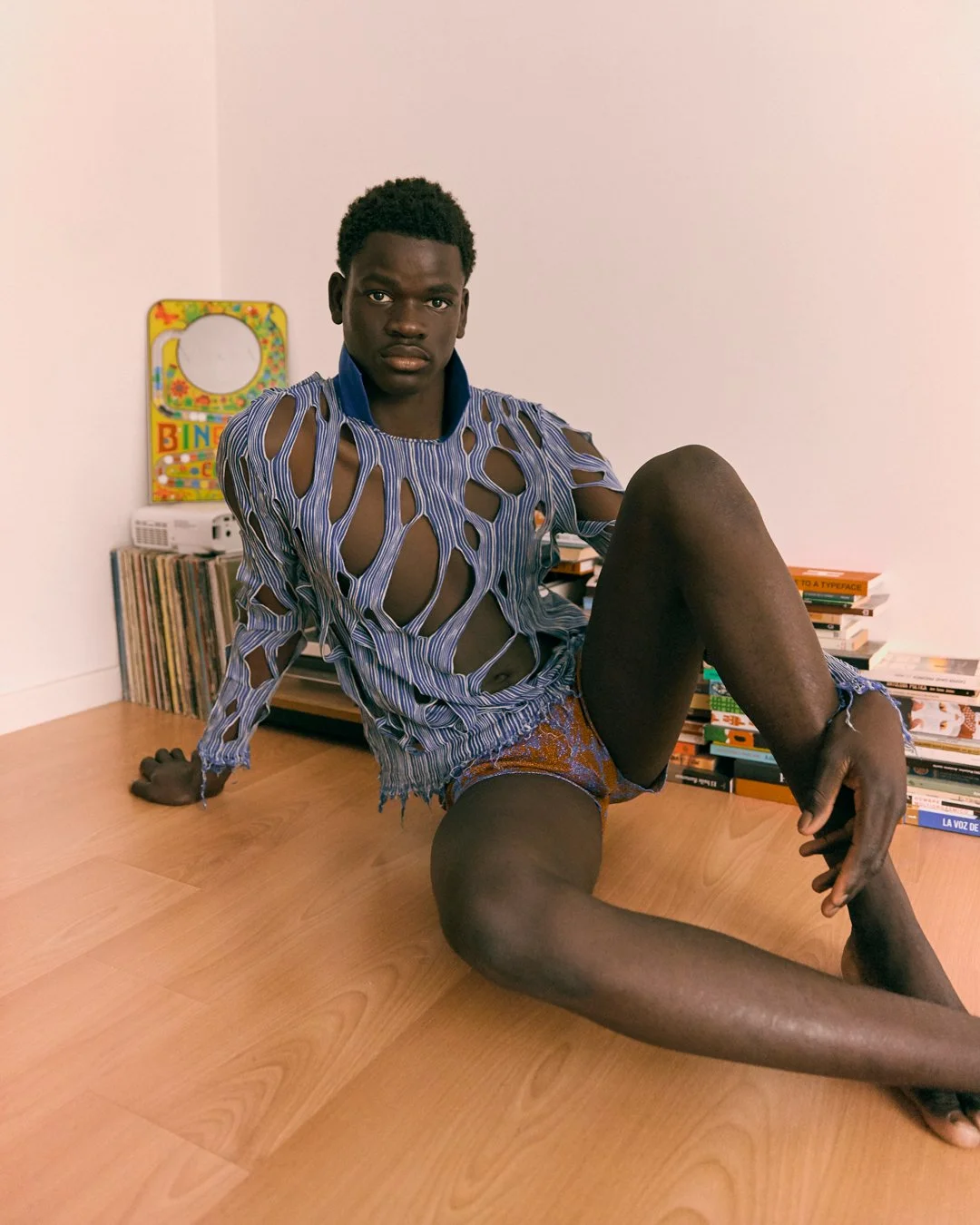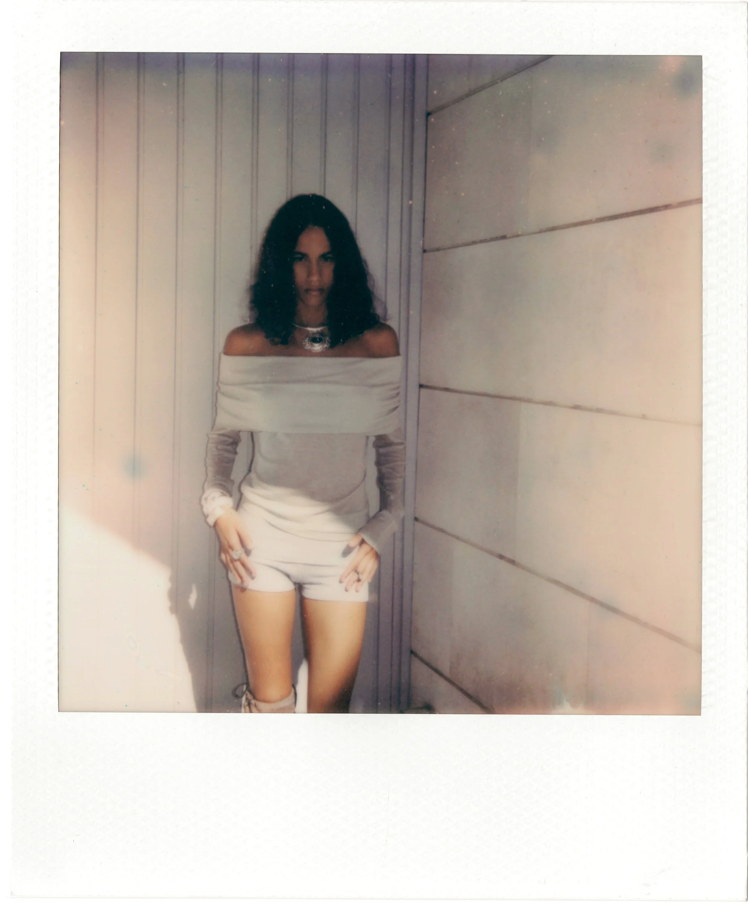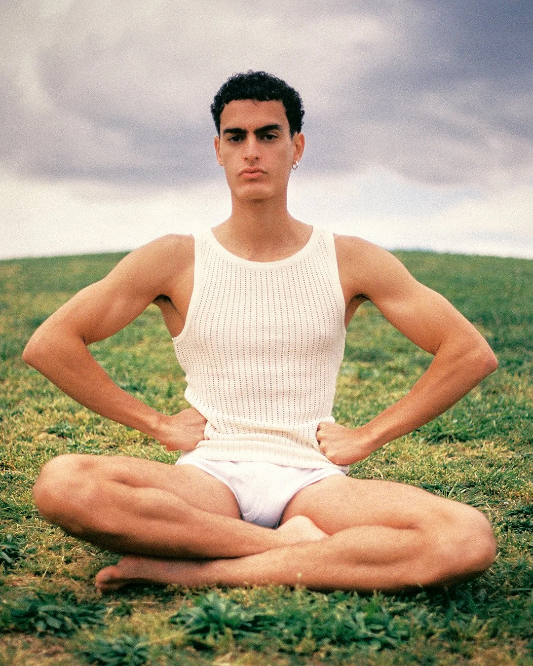 Joven con cabello largo y rizado, en una pose inclinada, recargada en una cama, con expresión pensativa. Lleva una camiseta blanca, pantalones claros, un cinturón marrón y un collar. La pared de fondo es blanca.