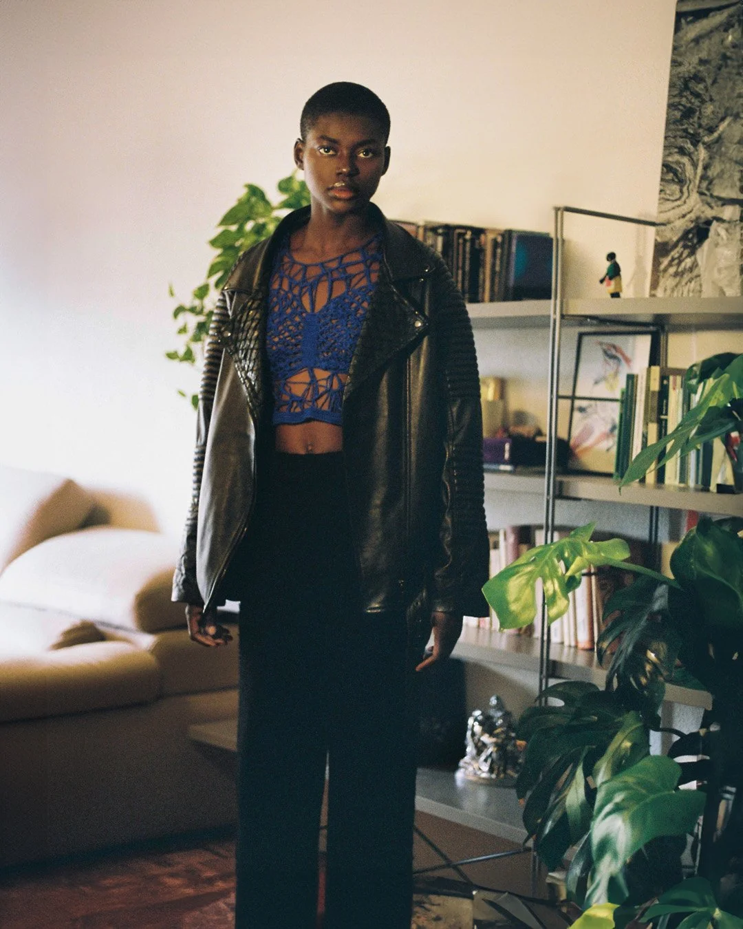 Mujer con cabello corto, ropa de moda con chaqueta de cuero negra, top de encaje azul, pantalones negros largos, en una sala con plantas, estanterías con libros y decoraciones.