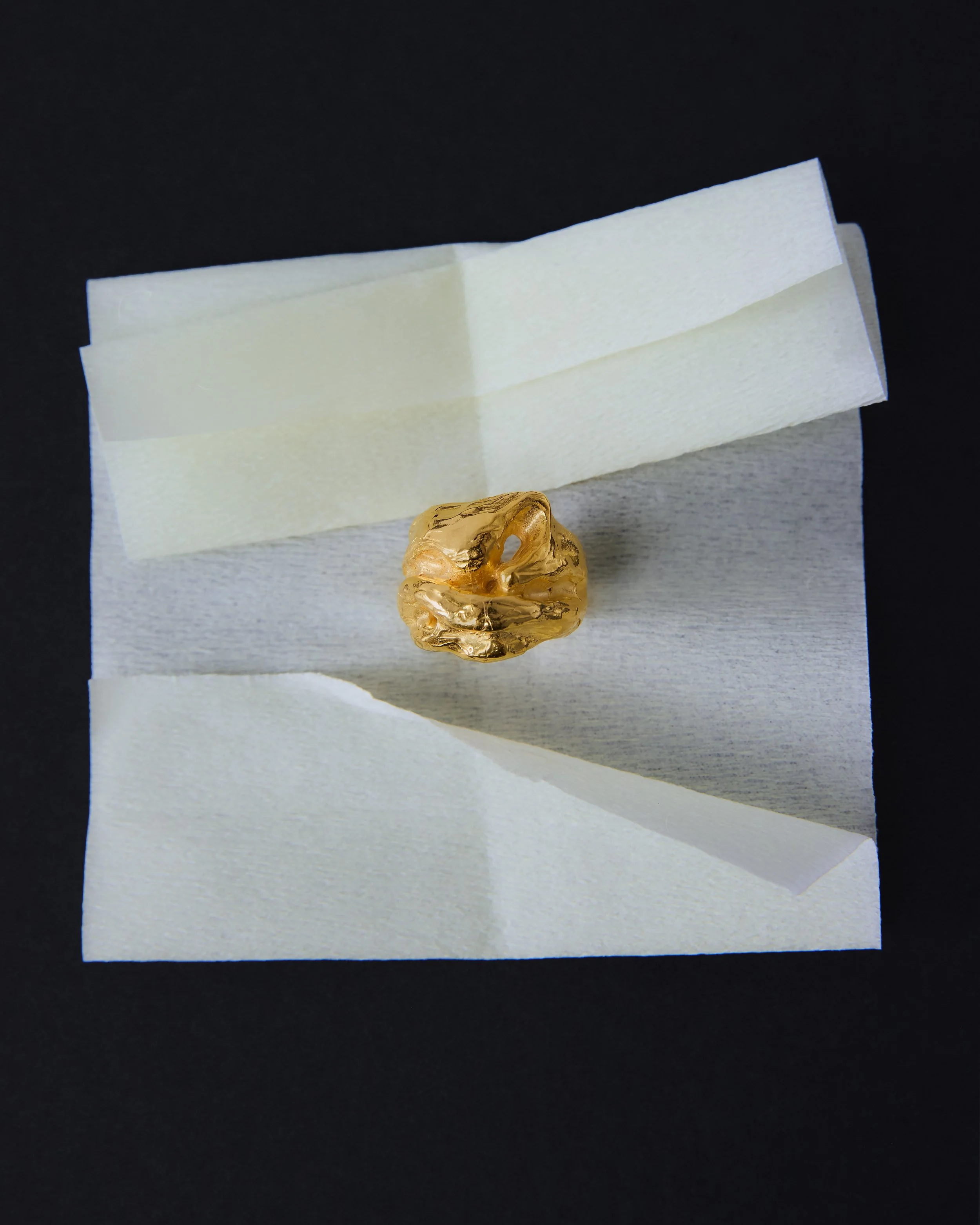 Joven con camiseta rasgada y pantalones cortos sentando en el suelo, rodeado de libros y vinilos.